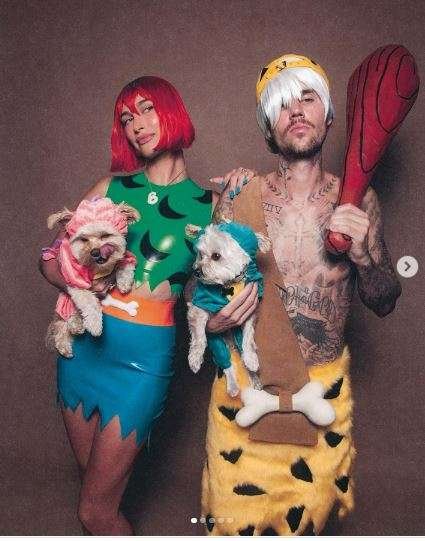 El cantante canadiense optó por personificar a Bam Bam, el hijo de Pedro Picapiedra, mientras que su esposa Hailey se convirtió en Pebbles, la hija de Pedro Picapiedra.