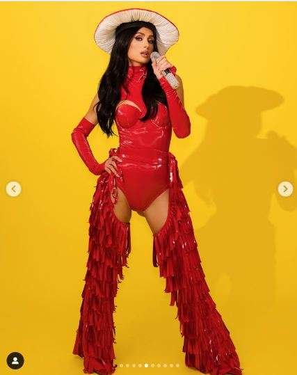 Su segundo atuendo fue igualmente impresionante, luciendo un vestido rojo con un sombrero de hongo que Katy Perry usó en uno de sus conciertos en Las Vegas, rindiendo homenaje a dos cantantes icónicas.